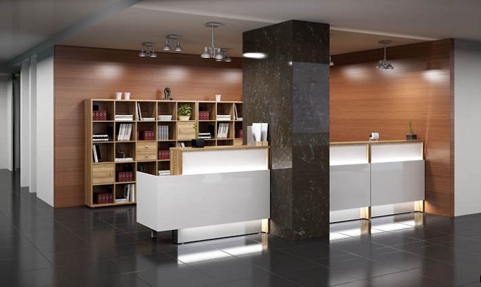 The furniture for the reception area of EUROPE RECEPTION also has excellent performance, high-end E1 chipboard and MDF from a foreign manufacturer are used for manufacturing, the upper countertops and side walls are 28 mm thick, which ensures durability and reliability. The reception desk is resistant to abrasion and chipping, due to the presence of a protective surface coating and an anti-shock edge.