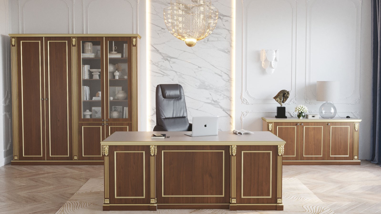 Don’t be confused, classical style is not about rough shapes and materials, but rather about harmony, reliability, wealth and comfort. So, don’t place anything grotesque in your office. If you plan to add pictures, potted plants and additional lights, they have to comply with the general style.