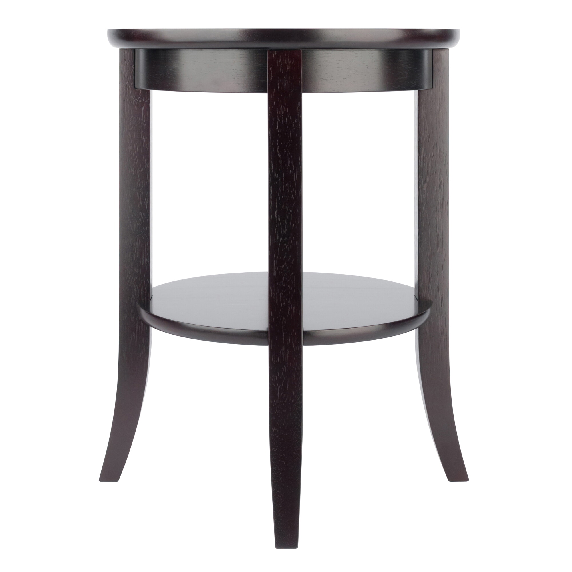 Unique design features slightly curved legs, round shapes, and a glass accent for a classic, antique feel