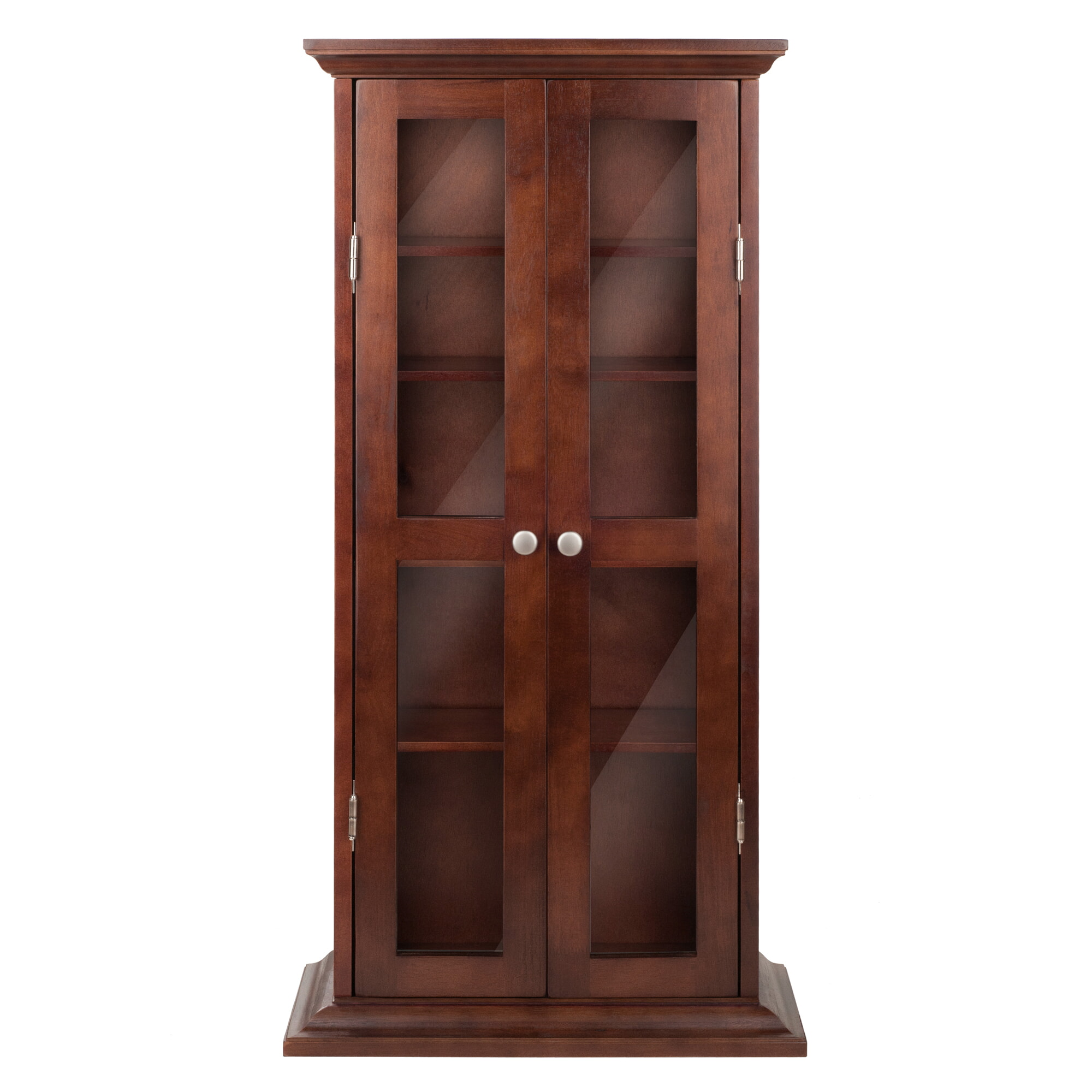 • Walnut finish and 2 glass doors with grid accent provide a classic, antique feel