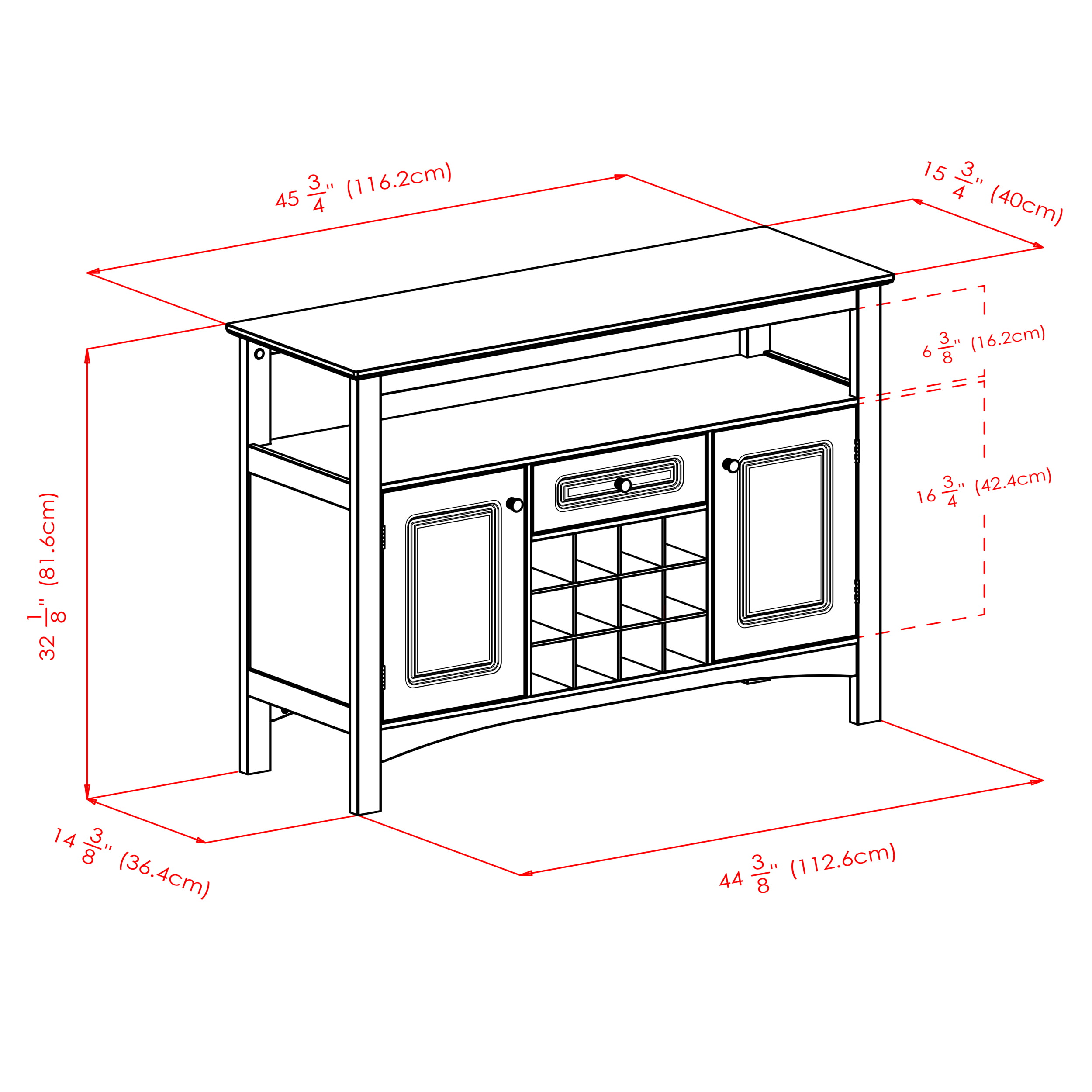 • Features a 12-bottle removable wine grid, large open shelf, 2 side cabinets, and a drawer for ample storage