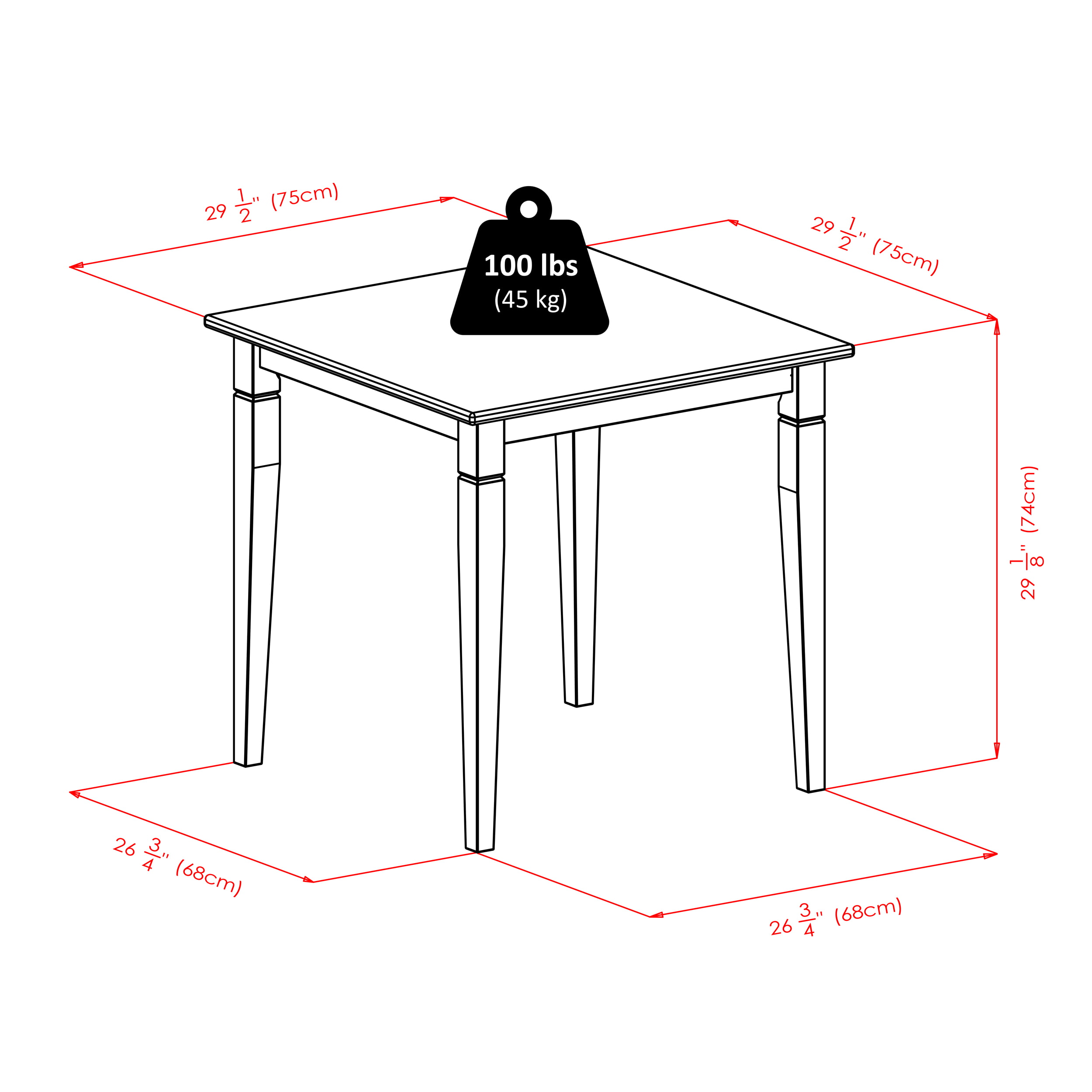 Table - 29.53 x 29.53 x 29.13 INChair - 16.54 x 18.63 x 34.65 IN