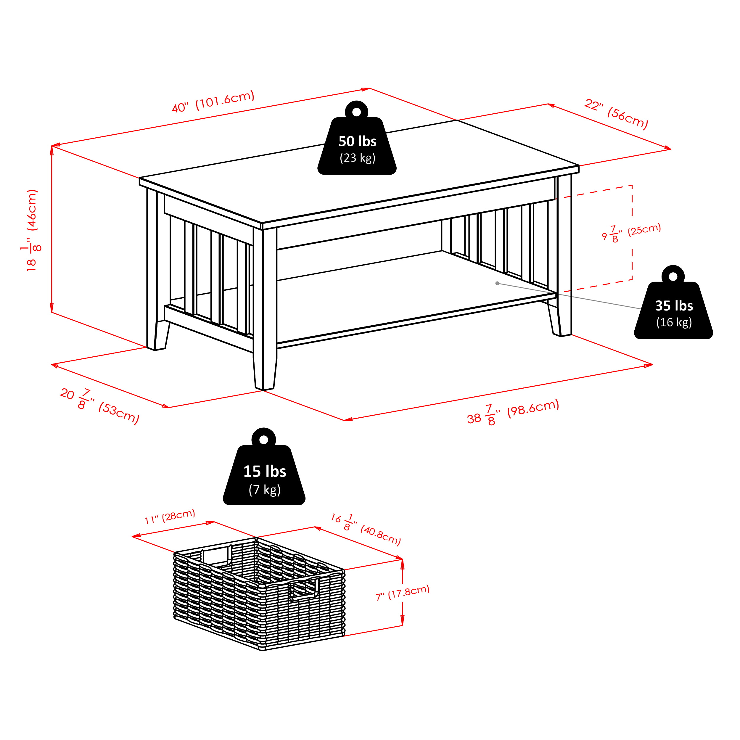 • Slatted sides on lower shelf keep baskets in place and add to table’s contemporary look