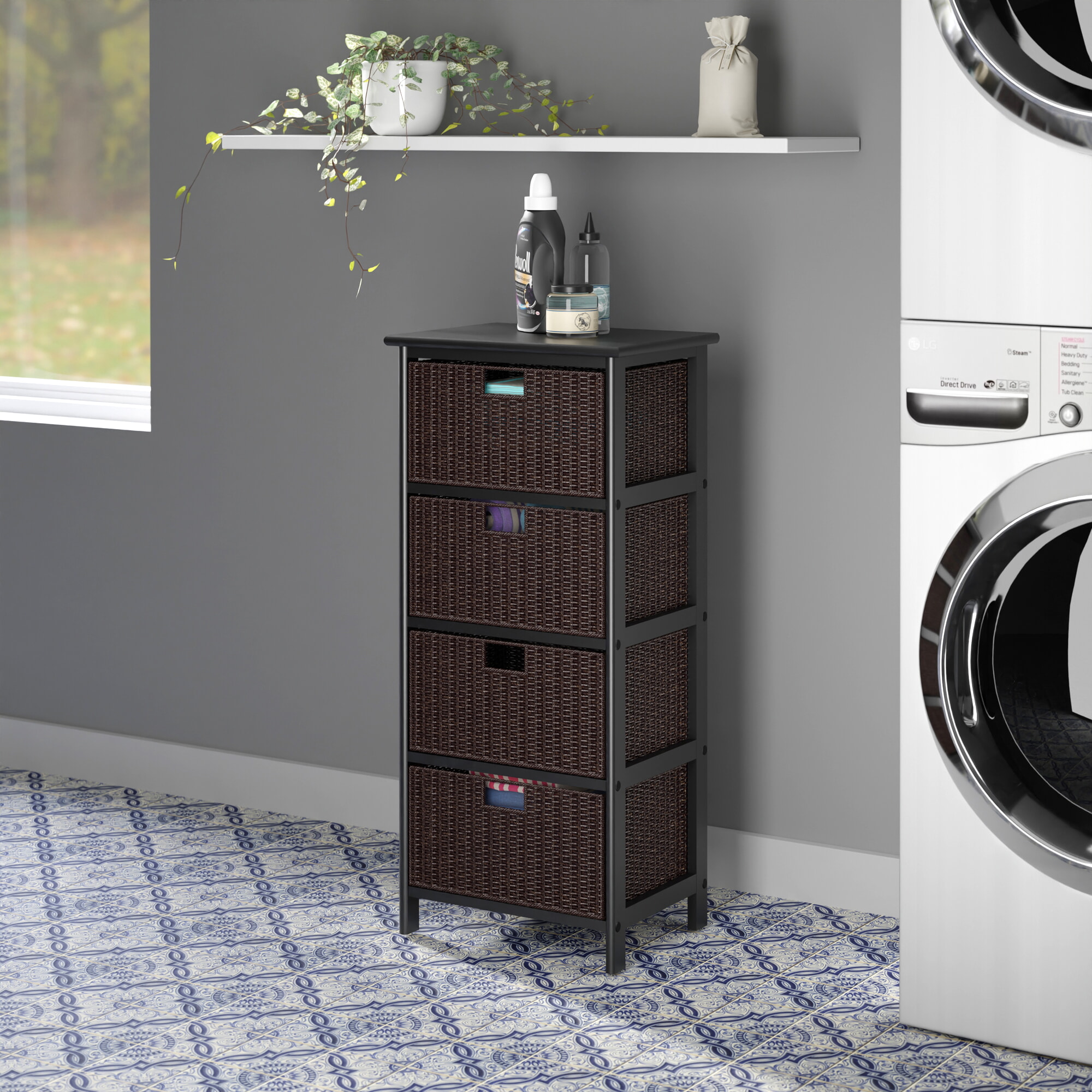 Omaha Storage Rack with 4 Foldable Corn Husk Baskets, Black and Chocolate