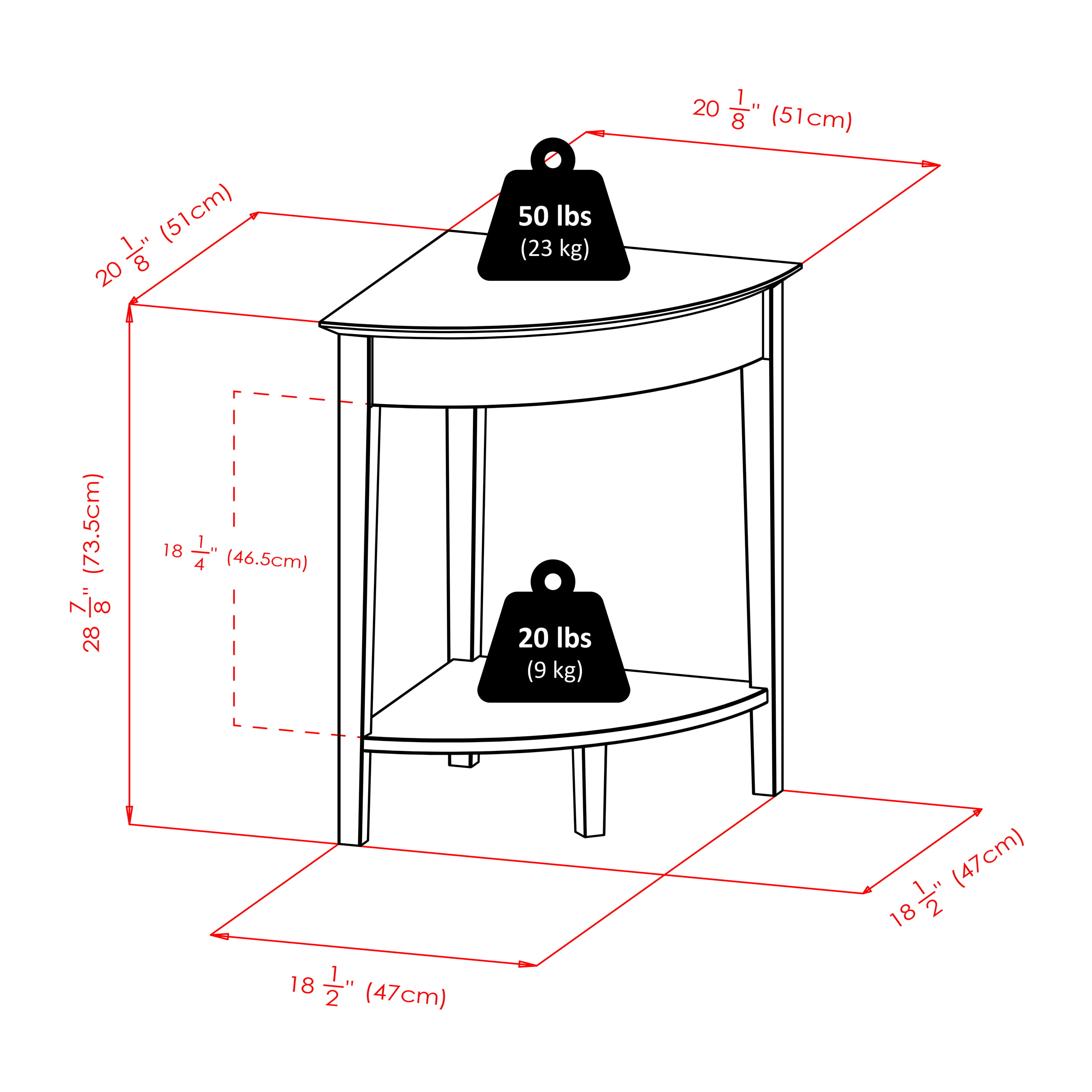 • Corner table with rounded finish and lower shelf is perfect for displaying photos, vases, lamps, and other items.