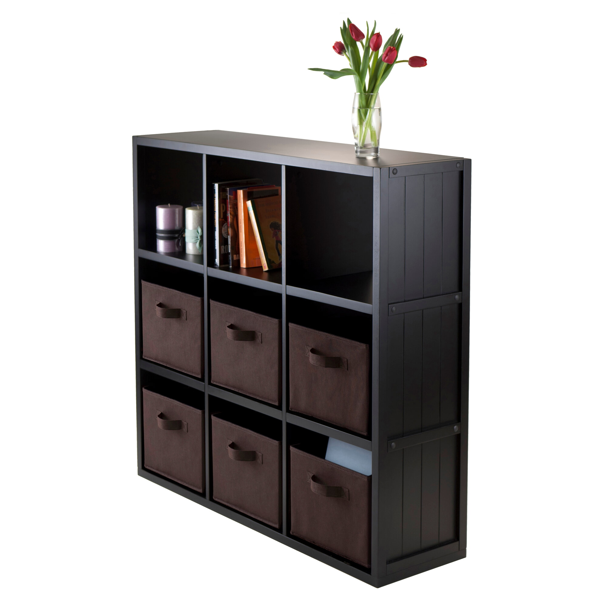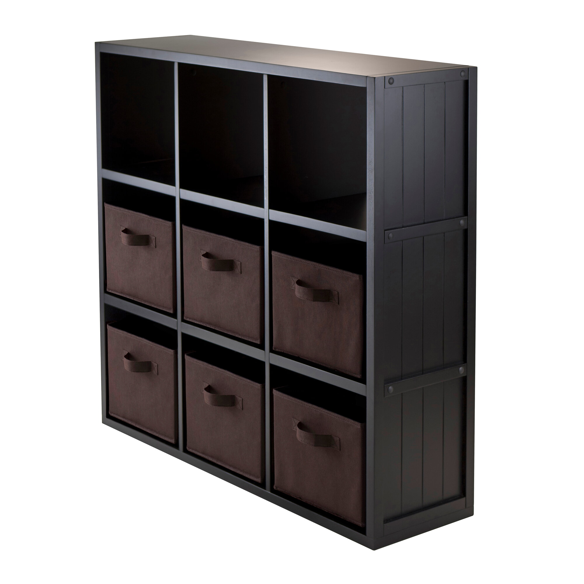 Timothy 7-Pc 3x3 Storage Shelf with 6 Foldable Fabric Baskets, Black and Chocolate